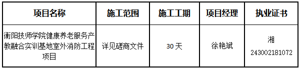 衡阳技师学院健康养老服务产教融合实训基地室外消防工程项目于2025年07月10日结束,现将成交结果公告如下:
